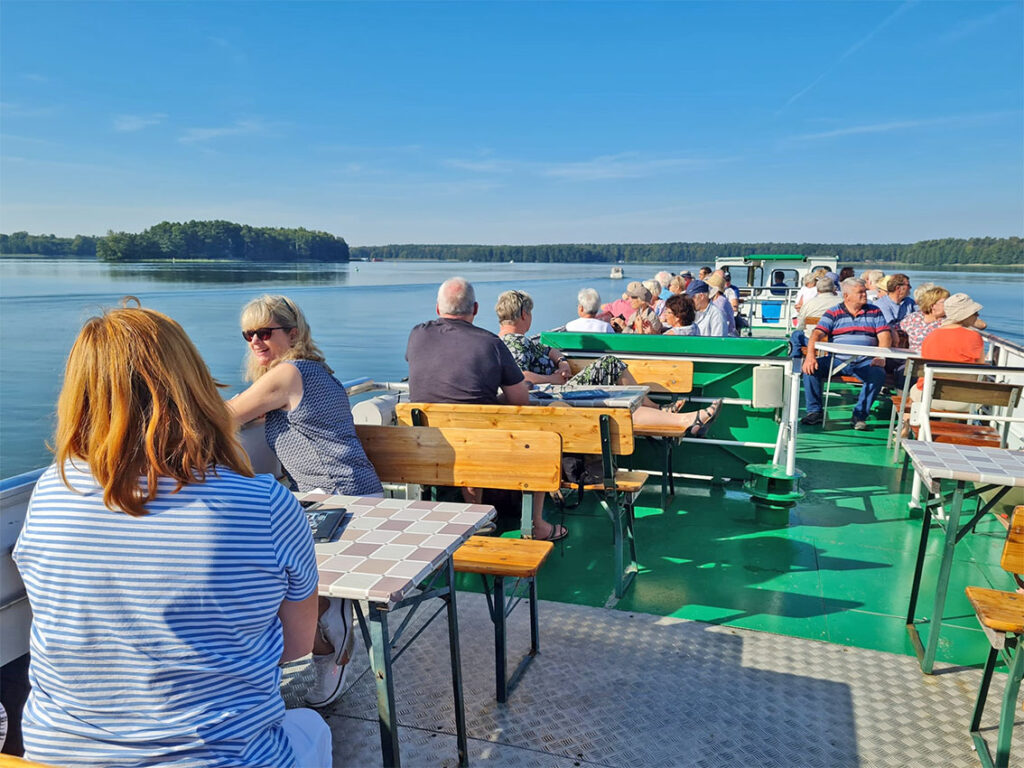 Punkt 6.30 Uhr ging es von Kraak aus Richtung Feldberger Seenlandschaft. Das Wetter zeigte sich von seiner besten Seite und wir hatten somit die Sonne als steten Begleiter. In Lychen angekommen sind wir auf das Fahrgastschiff „Möwe“. Diese hat uns an schönen und idyllischen Plätzen am Lychensee, auf der Woblitz vorbei an urigen Wäldern zur Schleuse Himmelpfort geschippert. Nach 1,15 m Fallhöhe sind wir dann auf den Stolpsee gekommen und wurden nach Fürstenberg gefahren. In Fürstenberg angekommen hat auch schon der Bus auf uns gewartet, um uns zum Mittagessen zu chauffieren. Im Stieglitzenkrug kamen wir in den Genuß von „Pute am Spieß satt“. Kugelrund ging es anschließend zu einer Rundfahrt durch den Nationalpark Feldberger Seenlandschaft. Der hiesige Reiseleiter Peter führte uns zum Aussichtspunkt Reiherberg, eine mit 143m höchste Erhebung in der Feldberger Seenlandschaft und einem fantastischen Blick über den Haussee Richtung Feldberg. Er führte uns nach Carwitz, wo Hans Fallada kurze Zeit lebte und sich heute sein Grab befindet. Er zeigte uns Feldberg mit vielen interessanten Stätten, welche unter anderem von dem Schriftsteller stark geprägt sind.