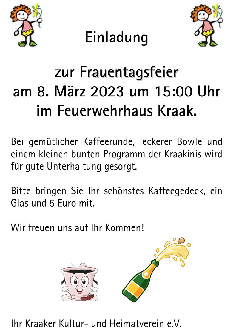 Kraak. ENDLICH!!! … Endlich war es wieder soweit. Nach der letzten Frauentagsfeier 2020 durften wir 2 Jahre lang diesen Ehrentag nicht feiern. Aber nun haben wir uns richtig ins Zeug gelegt und das auch noch an einem gesetzlichen Feiertag in Mecklenburg-Vorpommern. Dies hat der Kraaker Kultur- & Heimatverein auch gleich zum Anlaß genommen, um den Ehrentag der Frauen genau am 8. März 2023 feierlich zu begehen und diese aus Nah und Fern in den Gemeinderaum der Feuerwehr Kraak eingeladen. Sie sind zahlreich erschienen und kein Stuhl blieb frei. Mit den Begrüßungsworten unserer Vereinsvorsitzenden Christina Ahrens war das „Kaffeekränzchen“ eröffnet. Nach leckeren Kuchen, Torte und Kaffee zeigten die Kraakinis ihr Programm „Männerschnupfen“. Eine sehr lustige Vorstellung. Auch wenn wir unsere Männer dabei etwas auf die Schippe genommen haben, wir lieben sie und sind sehr froh, dass wir sie haben! Anschließend wurde bei schmackhafter Bowle noch nett zusammen gesessen und ausgiebig geklönt.
