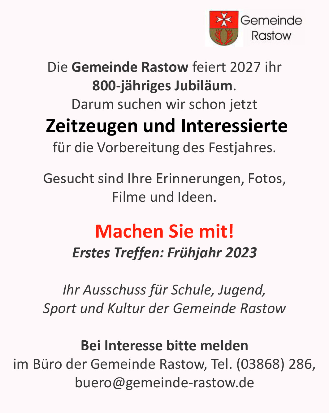 Am 06.05.2023 findet in Rastow von 10 bis 16 Uhr auf dem Parkplatz seitlich des Einkaufsmarktes ein Trödelmarkt statt, den die Volkssolidarität Rastow organisiert. Es werden keine Standgebühren erhoben. Jeder kann teilnehmen und verkaufen. Für Verpflegung ist gesorgt und um Anmeldung wird gebeten unter der Tel.Nr. 03868 300109 (Frau Taschenbrecher).