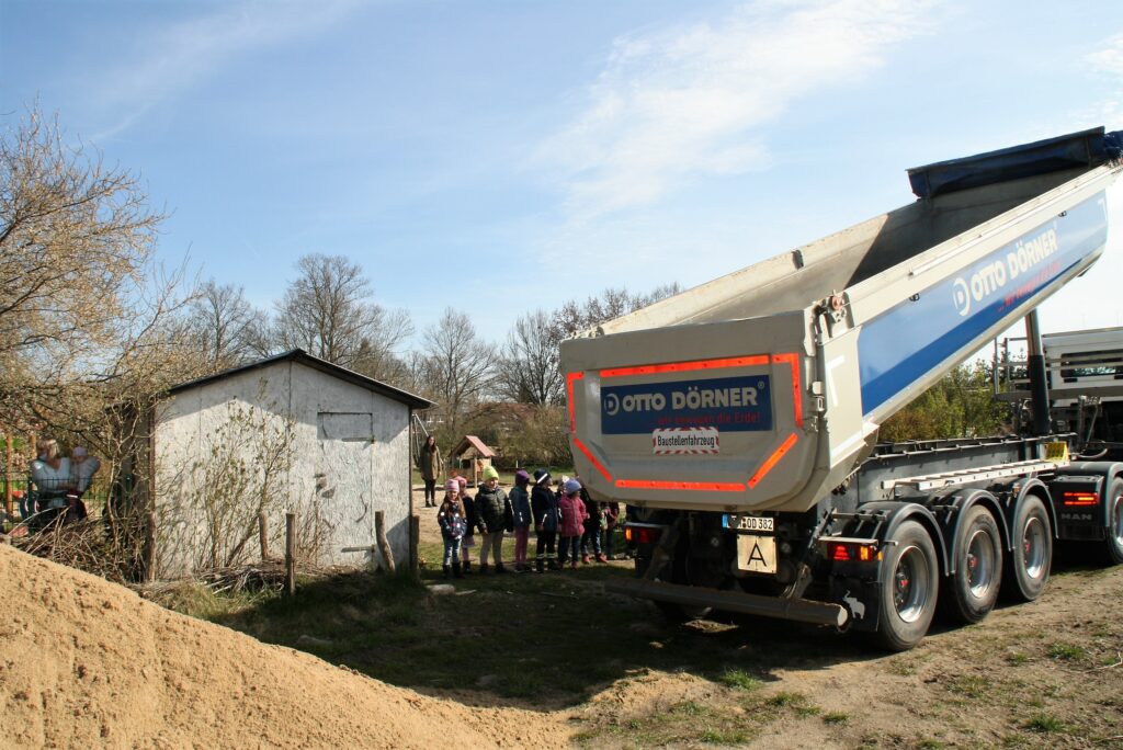 Pünktlich zu Ostern hat uns die Firma OTTO DÖRNER Spielsand kostenlos geliefert. Ein super Ostergeschenk! Auf unserem gesamten Kitagelände haben wir insgesamt 5 Sandkasten, welche bereits fast leer waren. Eine Schaufel hier, ein Eimerchen dort … besonders bei den Krippenkindern wird der Sand schnell verteilt. Dieses Problem hat auch das Team der Firma OTTO DÖRNER erkannt und uns 26 Tonnen zukommen lassen. Extra gewaschenes Material, damit die Eltern sich nicht über gelb-braune Hosen ärgern müssen.