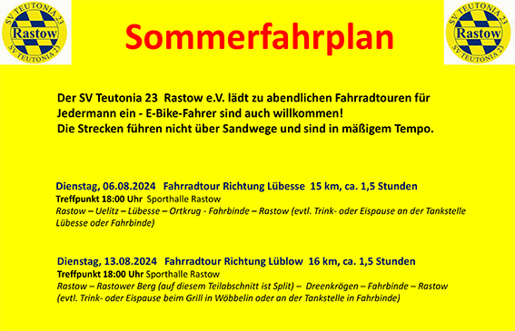 Auch in diesem Sommer organisiert der SV Teutonia 23 Rastow e.V. wieder abendliche Fahrradtouren in die Umgebung, zu denen alle herzlich eingeladen sind.