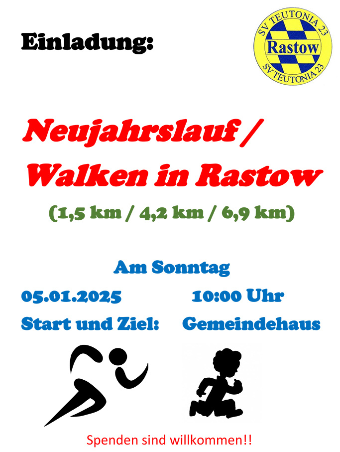 Der SV Teutonia 23 Rastow e.V. organisiert wieder einen Neujahrslauf, zu dem alle herzlich eingeladen sind.