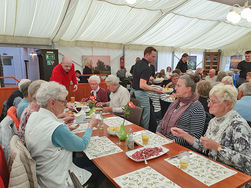 Der Empfang auf dem Betriebsgelände war schon einmal nett, denn ein Imbiss erwartete uns, bevor es losging. In einem interessanten Gespräch, verbunden mit lockeren Bemerkungen, erfuhren wir, wie wir bequem, zu einem gesunden und erholsamen Schlaf kommen können, wenn die materiellen Voraussetzungen stimmen. Selbst Skeptiker hörten aufmerksam zu. So verging die Zeit sehr schnell. Wenn auch die großen Käufe ausblieben, so hat doch mancher seine Schlafstätte durch Decken und Kissen ergänzt. Am frühen Nachmittag wurden wir zu einem deftigen Spargelessen in den Spargel- und Beerenhof Heuer in Fuhrberg, „Fuhrberger Spargelwirtschaft“, eingeladen. In einem großen Festzelt saßen wir an langen Tischen und fühlten uns als Gäste wohl.