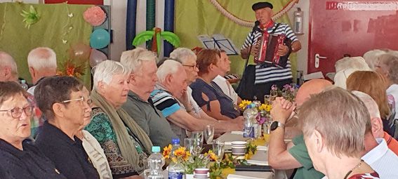 Für gute Laune und Stimmung sorgte dann Herr Dieter Deutsch mit seinem Unterhaltungsprogramm. Auf seinem Akkordeon spielte er Schlager, Oldies, Seemanns- und Stimmungslieder, die uns alle animierten, mitzusingen und zu schunkeln. Zwischen durch brachte er Leuschen und Riemels, die unsere Lachmuskeln reizten. Eindeutige Meinung aller: Das war dufte.